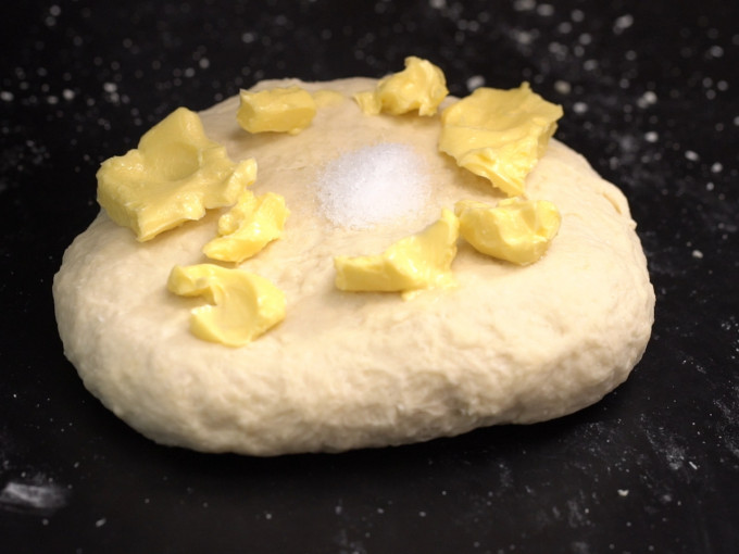 將麵團壓扁,放入鹽、室溫奶油於麵團中,持續搓揉、甩打至麵團的表面呈現光滑狀。