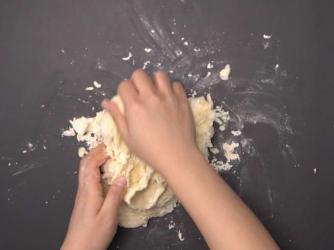 將麵團放置桌面上,抓住較長的一邊,甩打到桌面上,對折,再抓住另一邊持續甩打至不黏手的狀態。