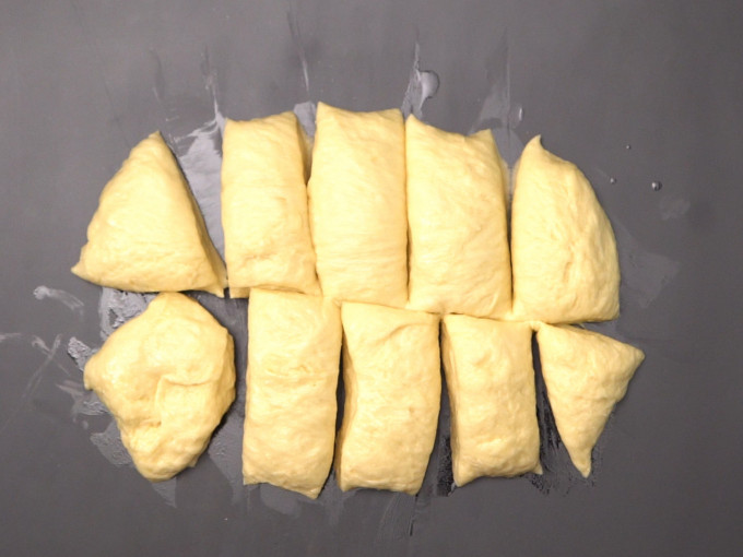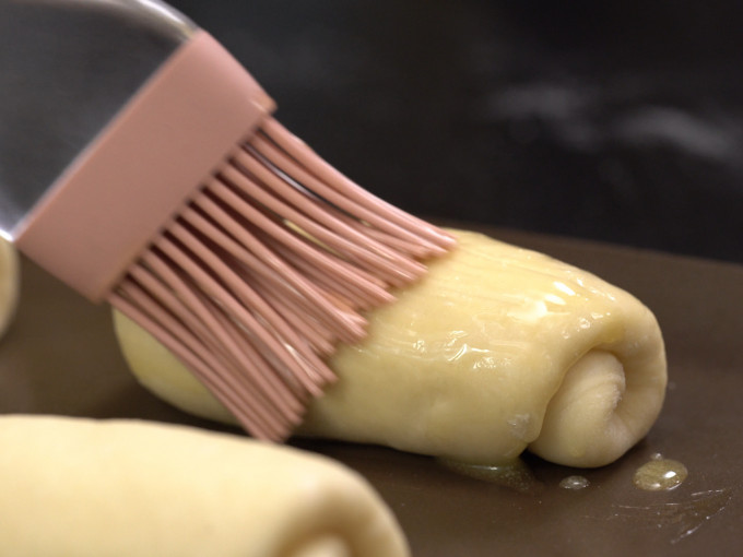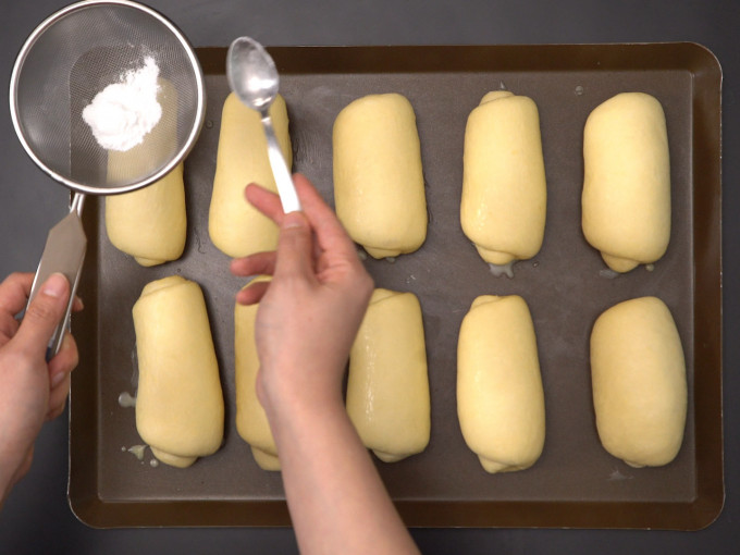 麵團的收口處朝下排列在烤盤上,表面抹上融化的無鹽奶油,再蓋上保鮮膜,發酵50分鐘。