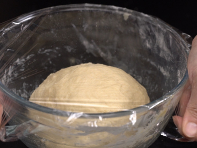 空盆內抹點油,將麵團放入,蓋上保鮮膜,讓麵團鬆弛10分鐘。