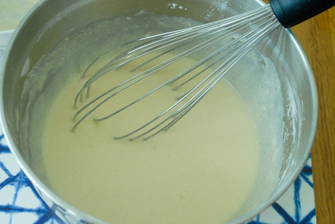 在碗內,將雞蛋、牛奶、椰奶和溶化奶油,拌勻