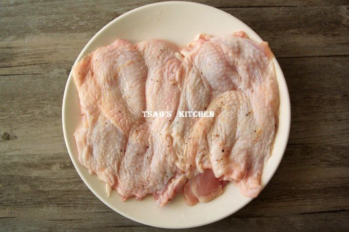 雞腿洗淨後,將肉較厚處劃幾刀防入鍋煎時肉縮過多,再加入醃料醃15分鐘備用。