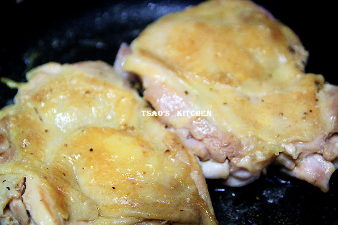 鍋中不放油,雞皮朝下中火慢煎。(雞會出油,完全不用使用食用油),煎到雙面金黃取出備用。
