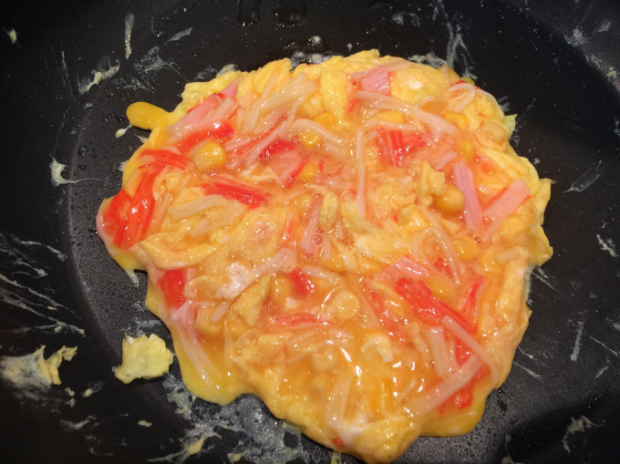 鍋熱下沙拉油,轉中小火下蛋漿並把蛋漿從四周外面向中心推,直到蛋漿開始成形。