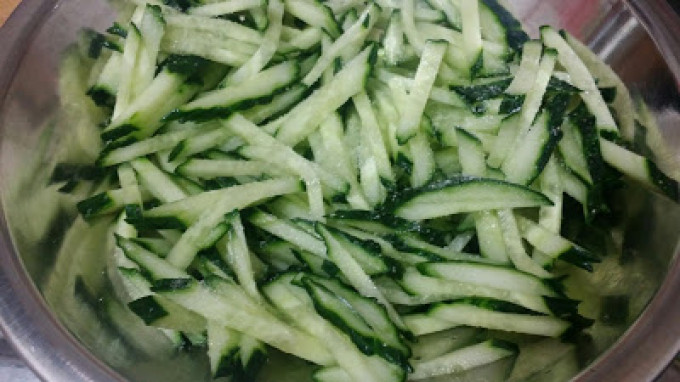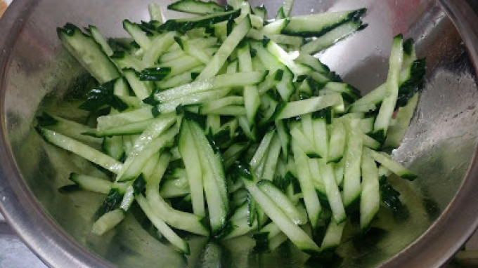 切成絲的小黃瓜撒上一些鹽巴,放置十分鐘。
