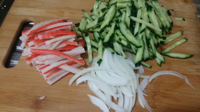 將小黃瓜跟洋蔥切絲,蟹肉撕成一條一條的備用。