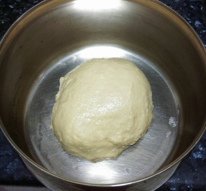 除奶油.鹽外,其餘材料放麵包機順序牛奶-蛋液-糖--麵粉-酵母攪拌成糰後加鹽5分鐘後置入奶油續攪15分,麵糰放入鋼盤(底稍抹油),入烤箱,放碗熱水進行一發40分鐘