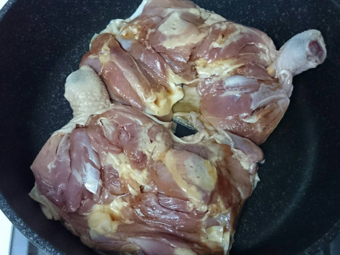 倒入醃漬雞腿排剩下的,蓋上鍋蓋小火燜煮至醬汁變濃稠,筷子能輕易插入雞肉即肉熟了。盛出稍放涼後切塊食用。