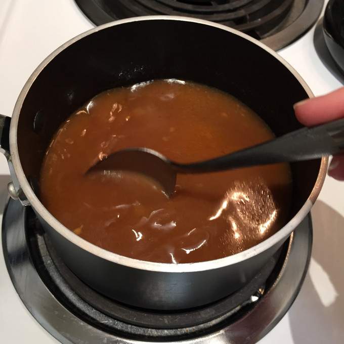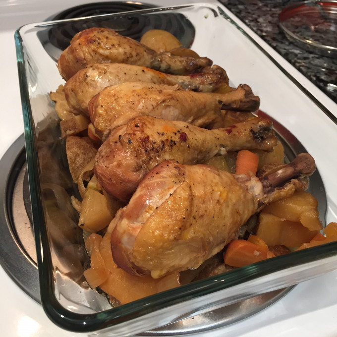 把雞腿和蔬菜們撈出來擺盤,並蓋上錫箔紙免得雞腿冷掉。取鍋底湯汁1又1/2杯,倒入醬汁小鍋加熱,再用1/3杯水+2湯匙玉米粉勾芡,濃縮後成為醬汁。