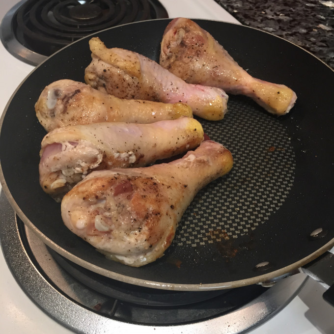 以中大火熱鍋,加入橄欖油,雞腿撒上鹽和黑胡椒後,煎到外層金黃,就可以放進慢燉鍋裡。