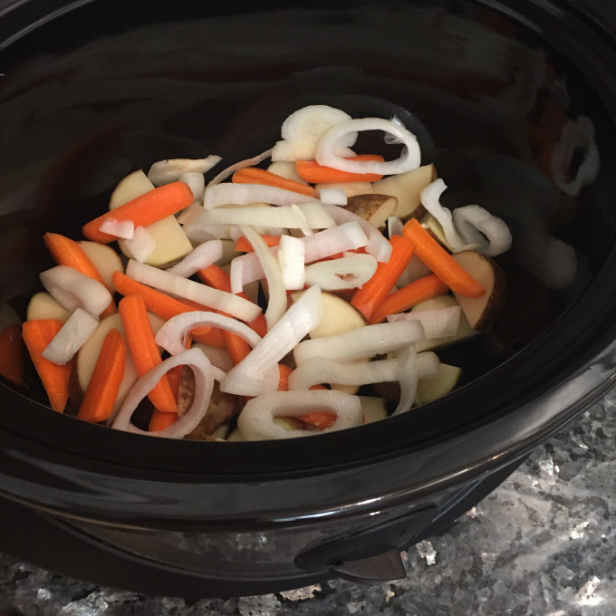 把馬鈴薯、洋蔥和胡蘿蔔切小塊後放進慢燉鍋裡。