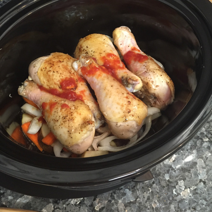將調味料混合均勻,就可以倒在雞腿上,慢燉鍋用low的火力開始燉6小時。
