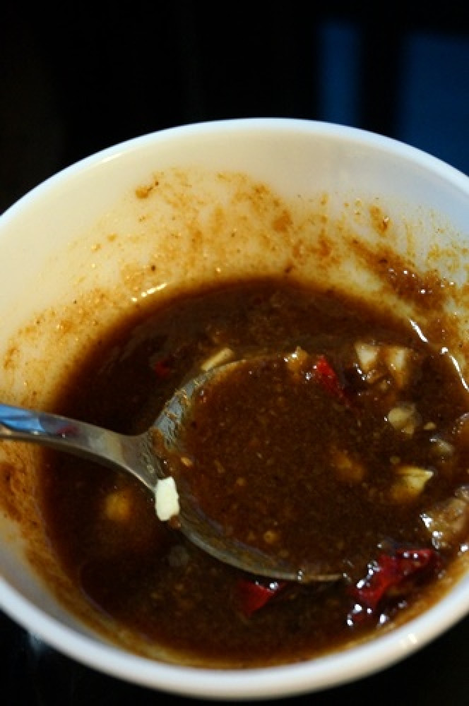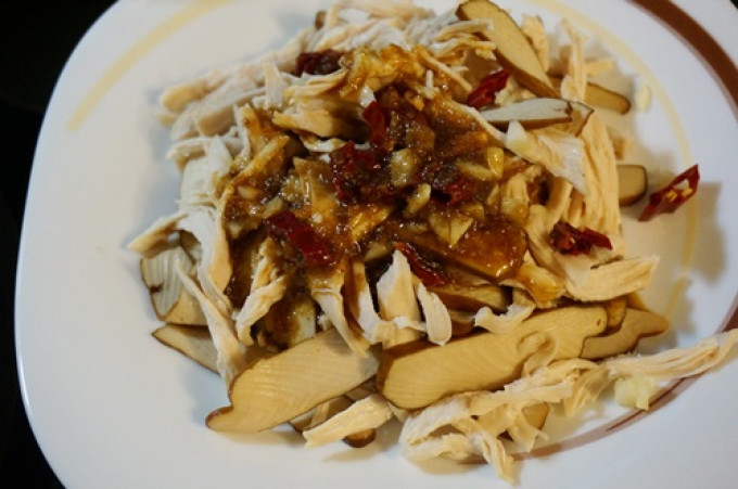雞肉蒸好時,取出放涼,再將鍋中的肉汁加上沙茶醬.糖及醬油調味成涼拌醬汁(口味可依個人喜好調整),再放入切好的蒜末及辣椒段拌勻備用
