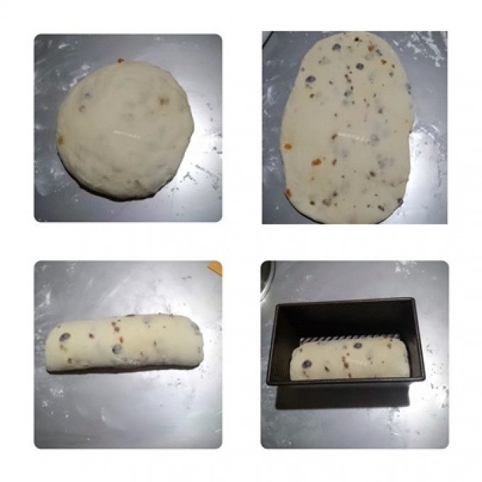 休息好的麵團表面灑些手粉避免沾粘,桿成橢圓形,由短邊捲起成柱狀,收口朝下放入吐司模中,噴些水放烤箱中再發酵至2倍大。