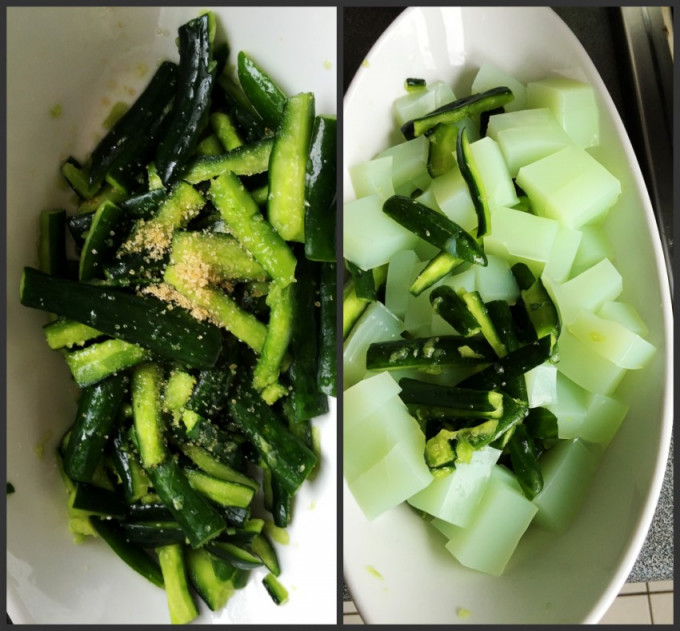 小黃瓜洗淨,拍打切段,用鹽抓捏倒出水分.
