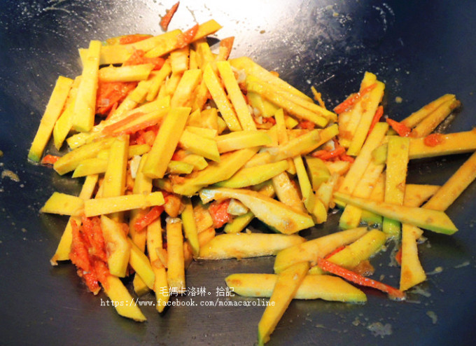 鍋內的蛋黃炒散開、 炒出香氣後,放入南瓜繼續拌炒
