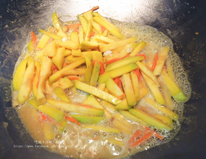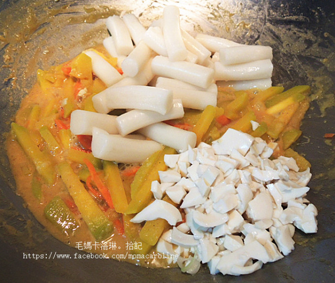 打開鍋蓋,南瓜等食材均已經熟透並且軟了,這時放入年糕、蛋白繼續拌炒。同時可以放一些鹽、糖,調整味道、加入白胡椒粉增加香氣,最後撒上蔥花