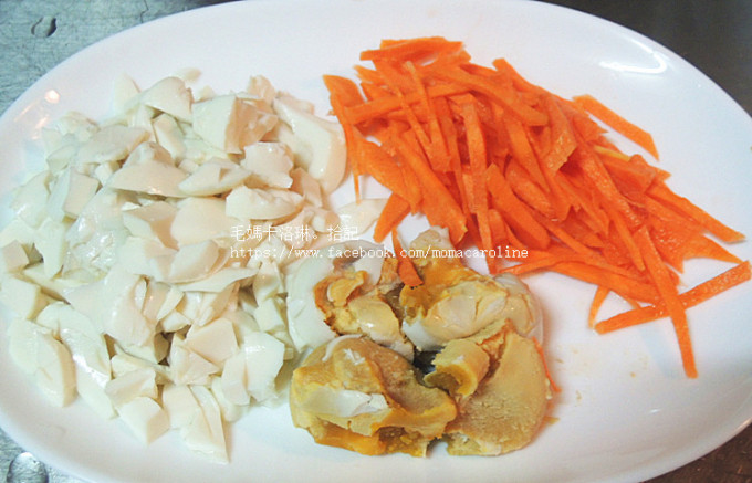 鹹鴨蛋外殼剝乾淨後,蛋白切小丁、蛋黃隨意剝小塊、紅蘿蔔切細絲