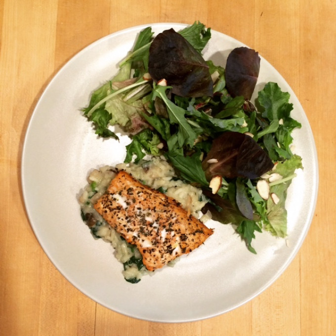 放點沙拉, 將燉飯盛盤, 放上鮭魚 就完成了!