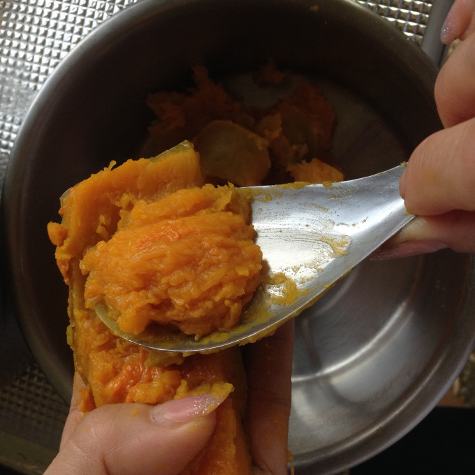 將南瓜切塊放入電鍋中蒸熟,將蒸熟後南瓜用湯匙將刮下