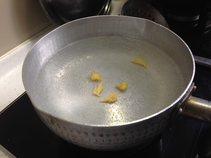 將揉合好的南瓜粉泥,抓一小塊一小塊丟入煮沸的水中