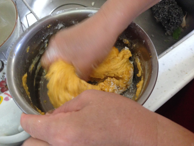 將南瓜與地瓜粉揉合,記得要將粉揉開,否則口感會一球一球
