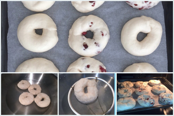 煮滾後轉小火 輕放發酵好的貝果 雙面川燙不超過30秒 取出瀝乾後 放入烤箱210度 約烤25分後 香噴噴的貝果就可以出爐囉