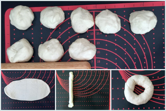 將麵團分成9等份滾圓 每份約65g 捍成橢圓型 揉成長條型 將另一端壓扁 兩端黏緊 做成㘣型 再發酵20分