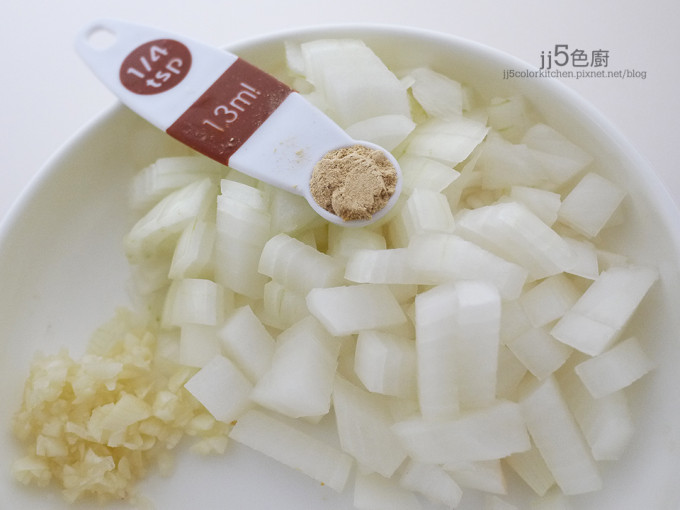 洋蔥切小丁,蒜頭切末。黑糖粉先量好,避免整包倒不小心倒過量。