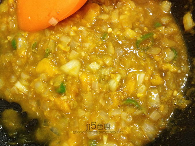 把炒香的洋蔥、蒜末、青辣椒倒進裝芒果醬的碗。