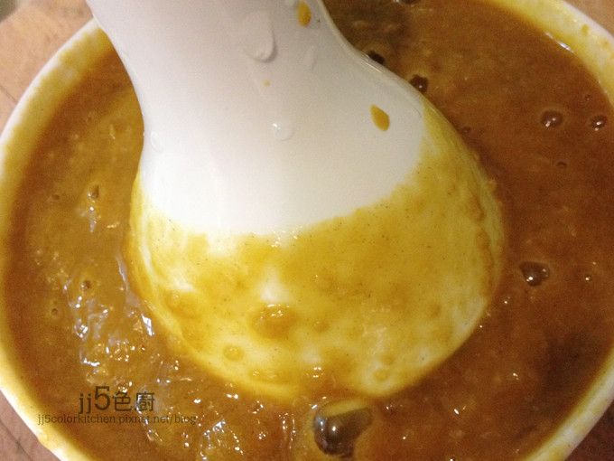 用手持攪拌器打爛成芒果辣醬。(如喜歡吃到洋蔥及辣椒顆粒感,可以跳過用攪拌器這步驟。)