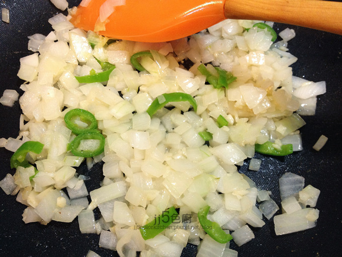 平底鍋下油,倒入洋蔥、蒜頭、青辣椒及黑糖炒均勻至洋蔥變軟。