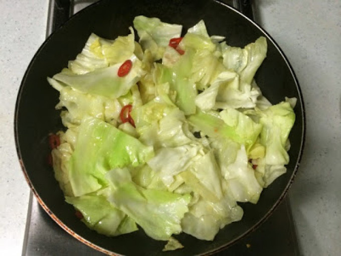 接著放入高麗菜拌炒。 高麗菜洗好後用手撥成小片狀。