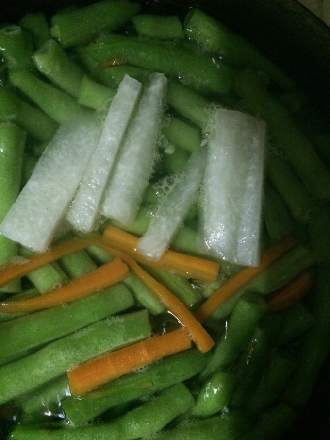 1.將四季豆.紅蘿蔔.洋地瓜入滾水川燙,撈起.再用冷開水泡涼.備用. 2.紅辣椒絲,蒜末用少許油煸至金黃.