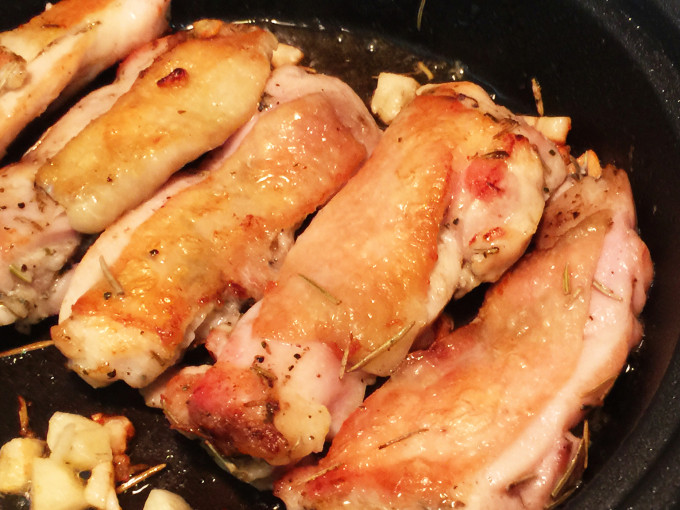 熱鍋不放油,雞皮朝下先煎出油,把醃料的蒜末也加進去煎香