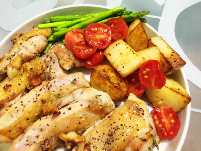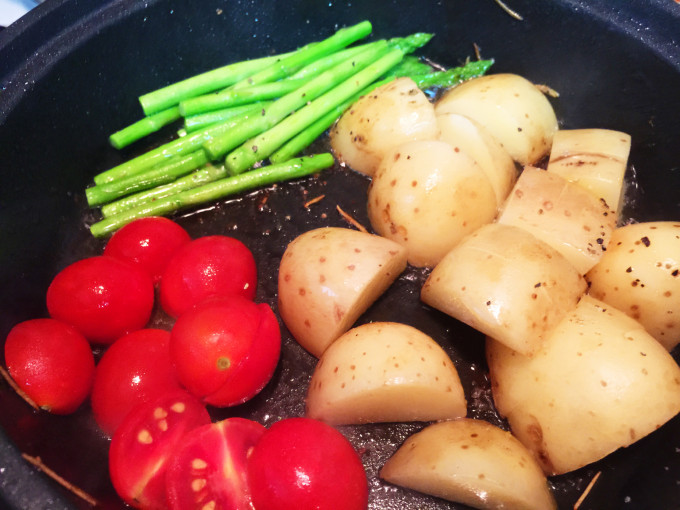 用原來鍋子裡的雞油,加入馬鈴薯及蘆筍,最後加小番茄,炒熟煎熟,灑點鹽巴跟黑胡椒就可以起鍋囉! (我喜歡小番茄稍微煮過,看個人喜好不煮直接當配菜也可喔)