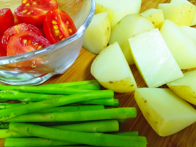 蘆筍洗淨切兩段、小番茄洗淨對半切,馬鈴薯洗乾淨,加點水用微波爐叮3~5分鐘,翻面再叮3~5分鐘後,切大塊(不喜歡皮的可去皮),蔬菜可以個人喜好隨意搭。