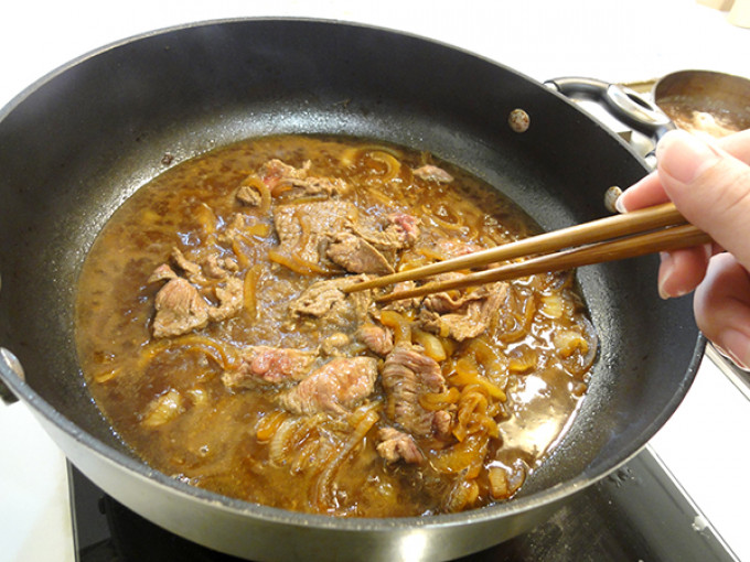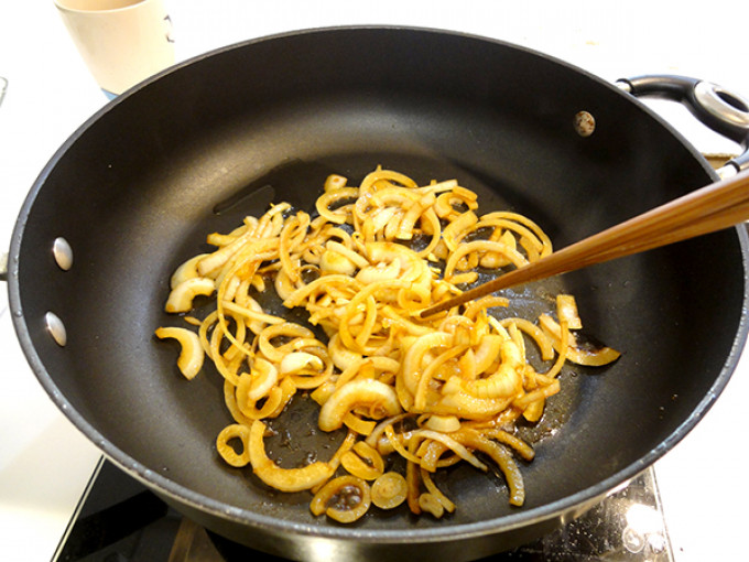 將洋蔥切絲下鍋炒軟,再將雞高湯、醬油、味醂、米酒倒入鍋中煮滾。