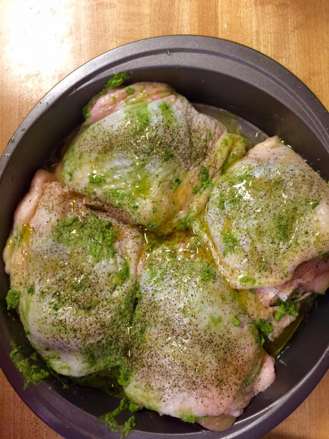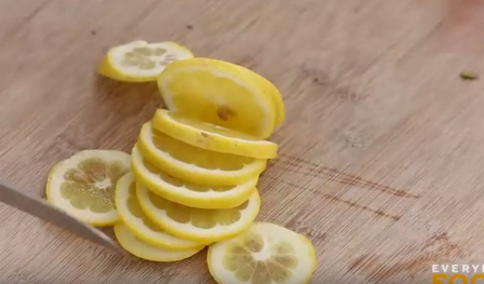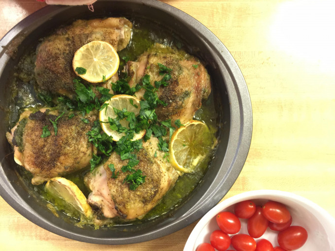 塞不完的也可在表皮上塗抹一些。最後撒上一些調味,黑胡椒和鹽適量,放上切好的檸檬片,就可以拿去烤箱烤35分鐘以上直到雞肉烤熟!