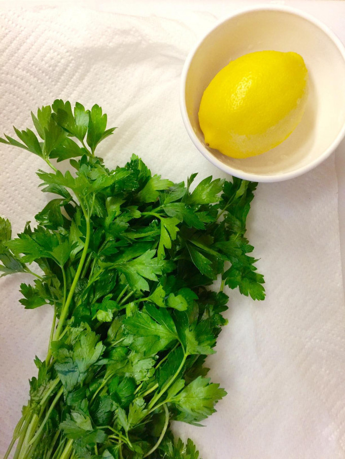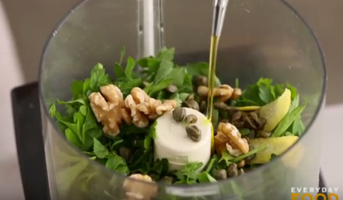 再來製作Parsley的醬,香芹洗乾淨擦乾,黃檸檬削兩到三片表皮,放入食物攪拌機,加入食用核桃,橄欖油,水,開始打碎攪拌。