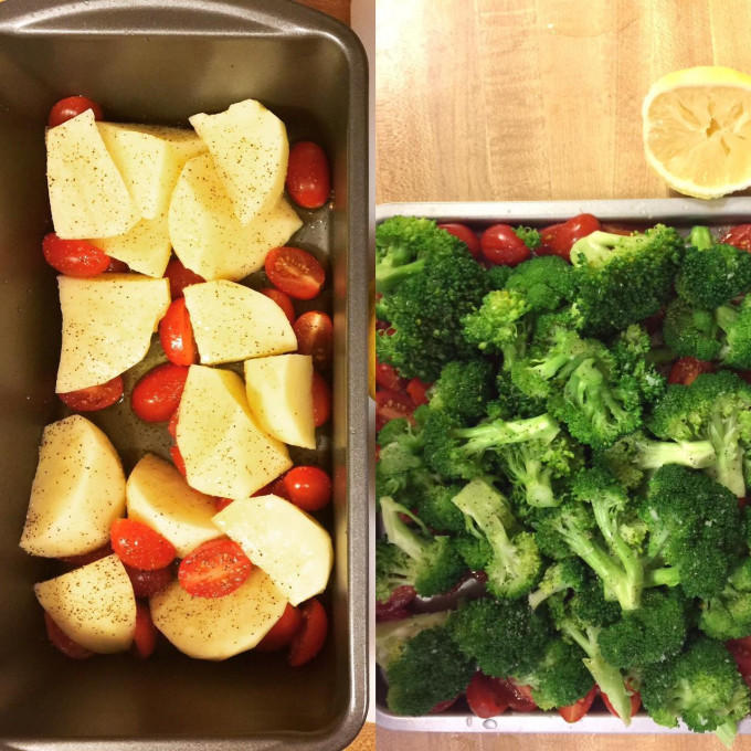 首先先將馬鈴薯,小番茄洗淨放在烤盤上,撒上適量黑胡椒及鹽,就可先放進烤箱450度F,預烤15分鐘。