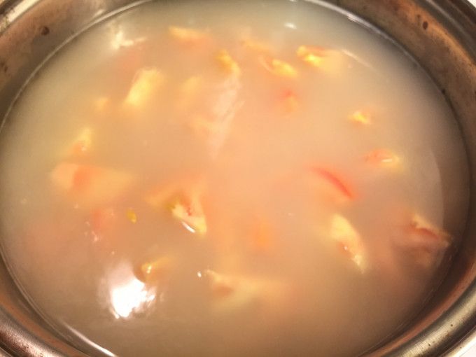 熱煲,放入魚湯及水煲滾,倒入蕃茄及薑汁。
