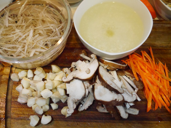 備料,牛蒡外皮簡易的用刀背將較粗糙的部份去掉,然後削成絲泡水,菱角切對半,香菇切片,紅蘿蔔切絲,高湯:440cc的水+5g的烹大師(昆布口味)