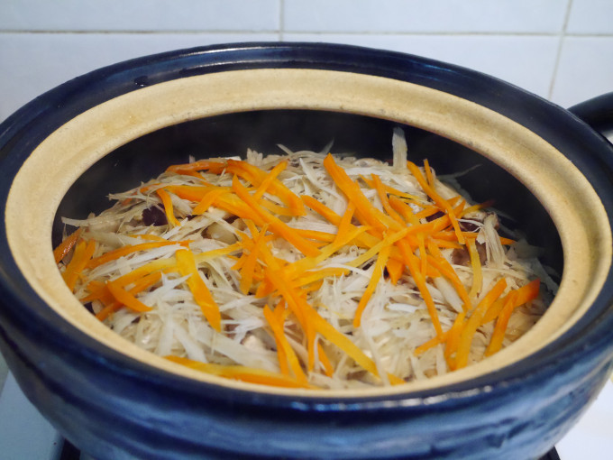 鋪上菱角、牛蒡絲、紅蘿蔔絲