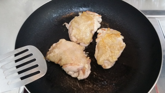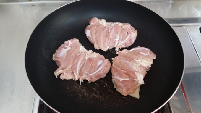 中小火熱鍋,不用放油,雞皮朝下先煎。