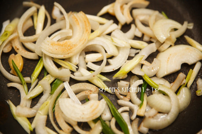 接著用同一油鍋將洋蔥、蔥白與大蒜下鍋爆香。