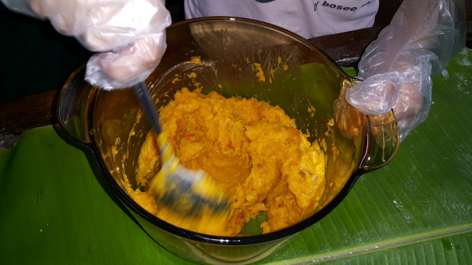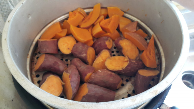 南瓜洗淨,去皮切塊,放入電鍋內蒸熟。