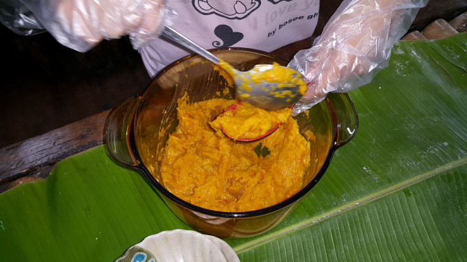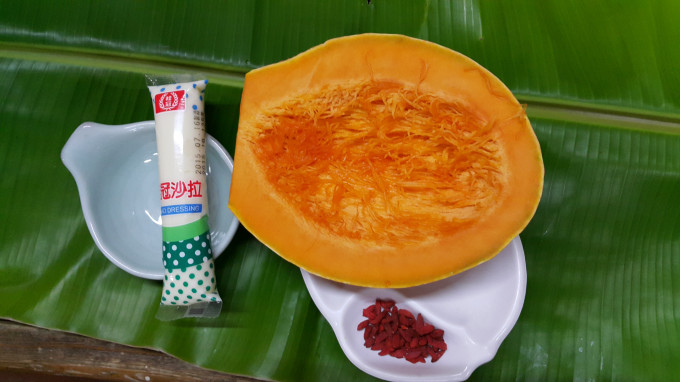 在南瓜泥頂端放入2~3顆的苟杞即可。