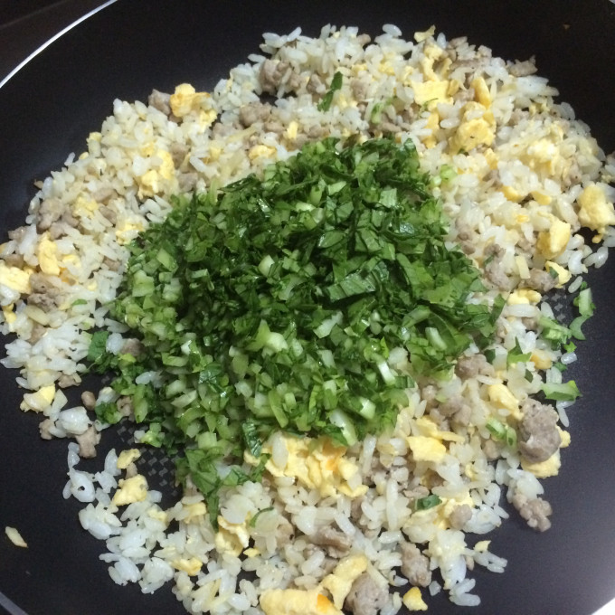 等蛋炒飯大致完成後,就可以將青江菜末一起拌炒了,此時清新香氣撲鼻,起鍋前加點鹽巴跟胡椒粒調味就可以了。