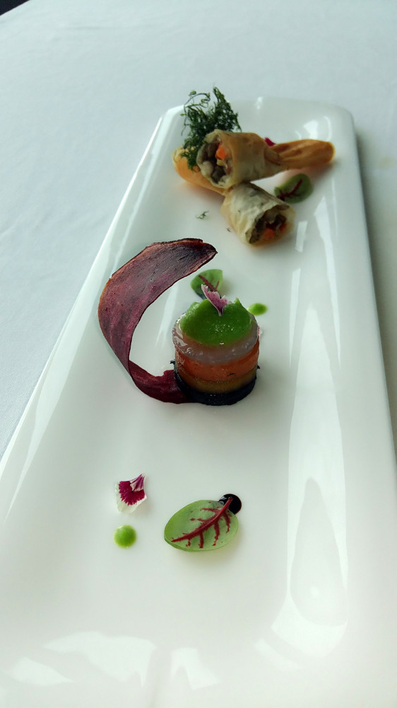 取一長盤將紅蘿蔔,白蘿蔔,黃蘿蔔,紫蘿蔔依序堆疊,淋上核桃油,青豆仁醬,在將 半圓型的芋頭地瓜擺上蘿蔔塔旁,放上食用花,酸模苗,青豆醬點墬,在將綠扁豆脆皮捲對切擺 上長盤另一端,放上茴香後完成